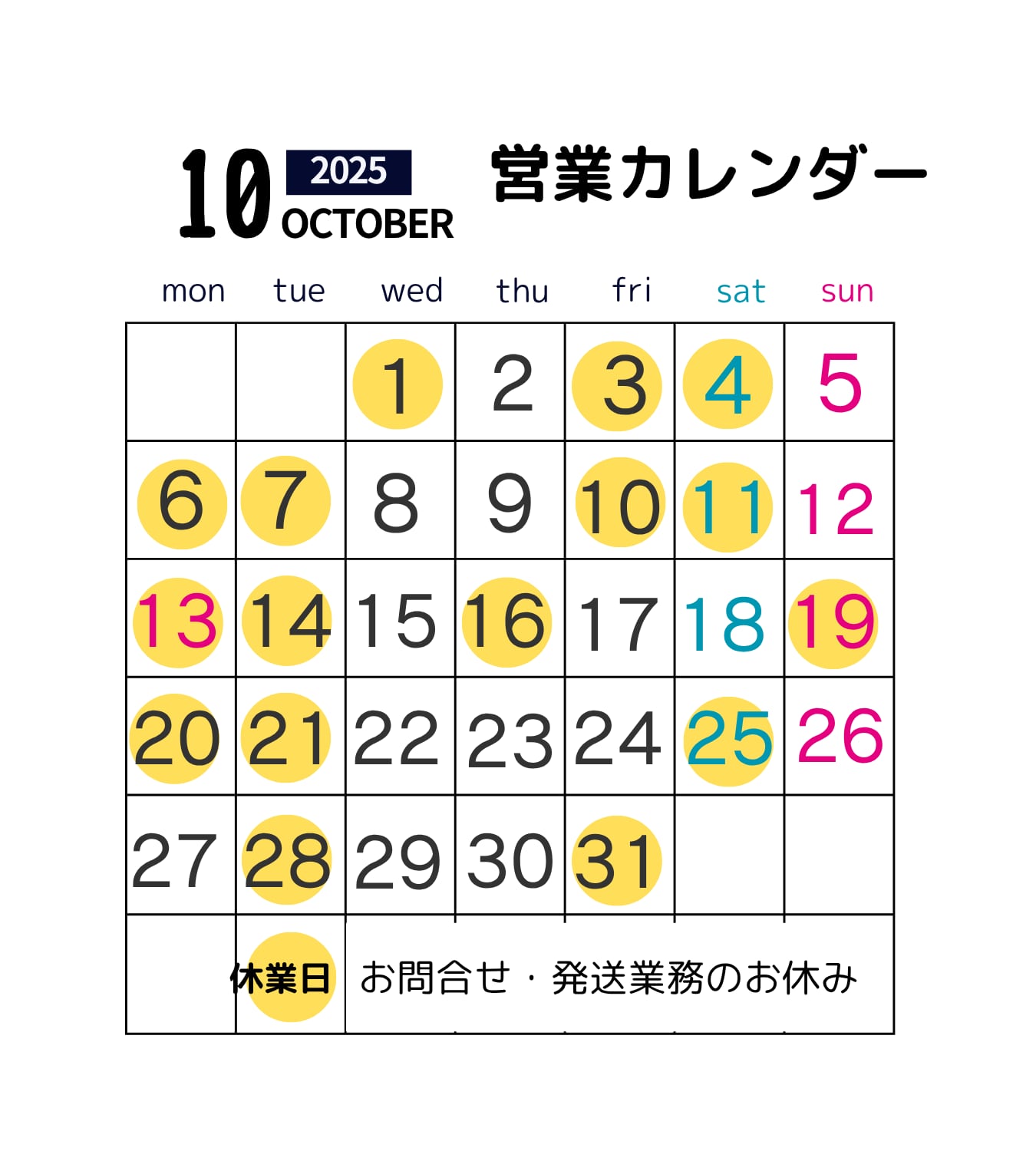 お問い合わせ対応および発送業務をお休みさせていただく日は、以下の通りです。