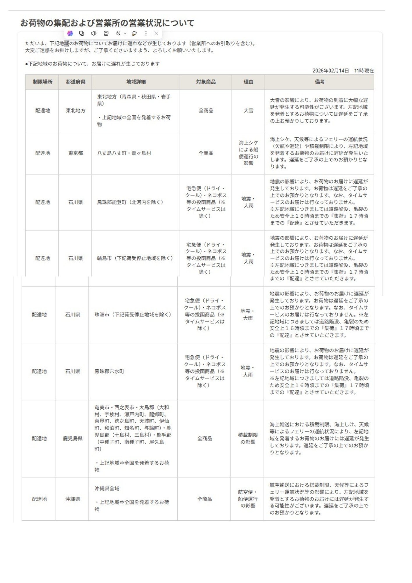 現在 大雪の影響により一部地域で配送遅延が発生しております。