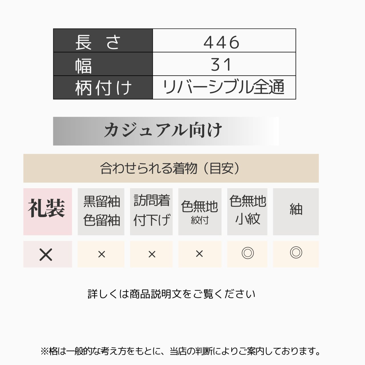 全通で446cmとやや長めのため、柄出しに悩まず420cm前後では少し短く感じる方にもおすすめです。