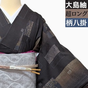 【超ロング】大島紬 袷 正絹 色紙に花柄織出し チャコールグレー 丈173裄66.5
