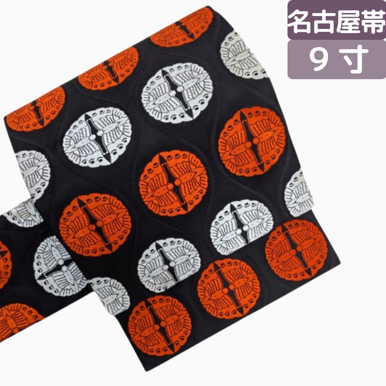 名古屋帯, 正絹, 黒い帯, 向かい蝶, 赤白, アンティーク調, カジュアル帯, 通し柄, 未使用品, 大正ロマン