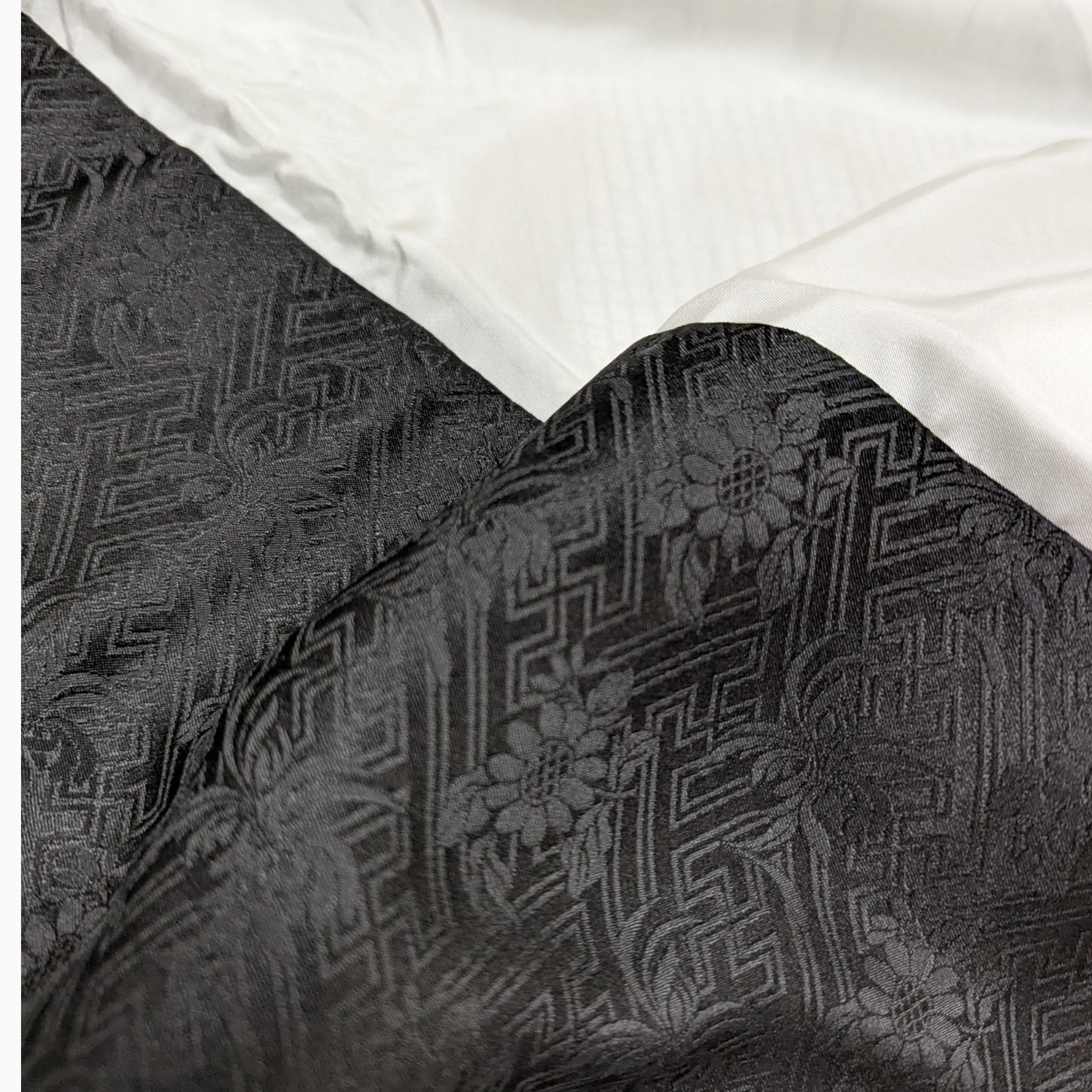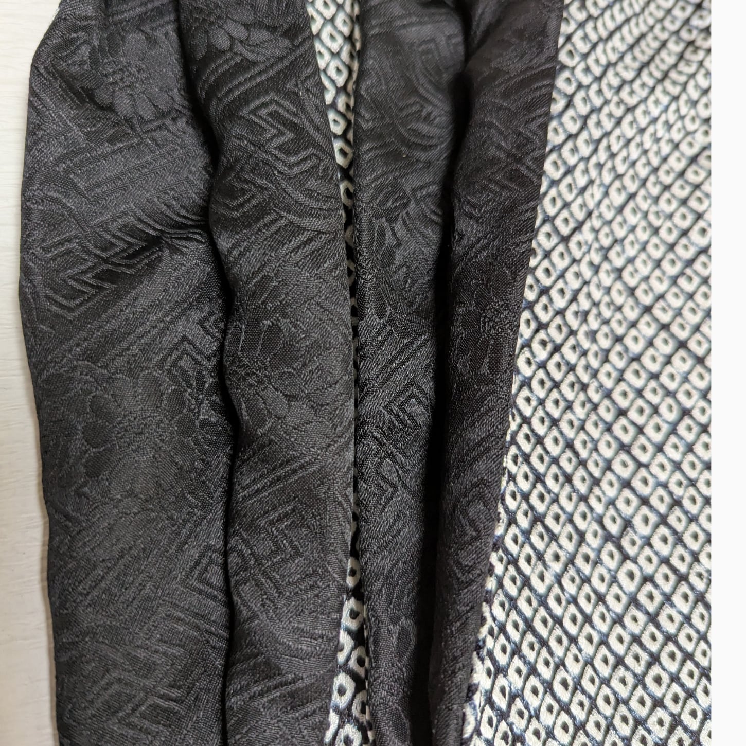 黒と白のみで表現された総絞りの柄は、見る人によってさまざまな表情を想起させ、想像力を掻き立てる意匠。