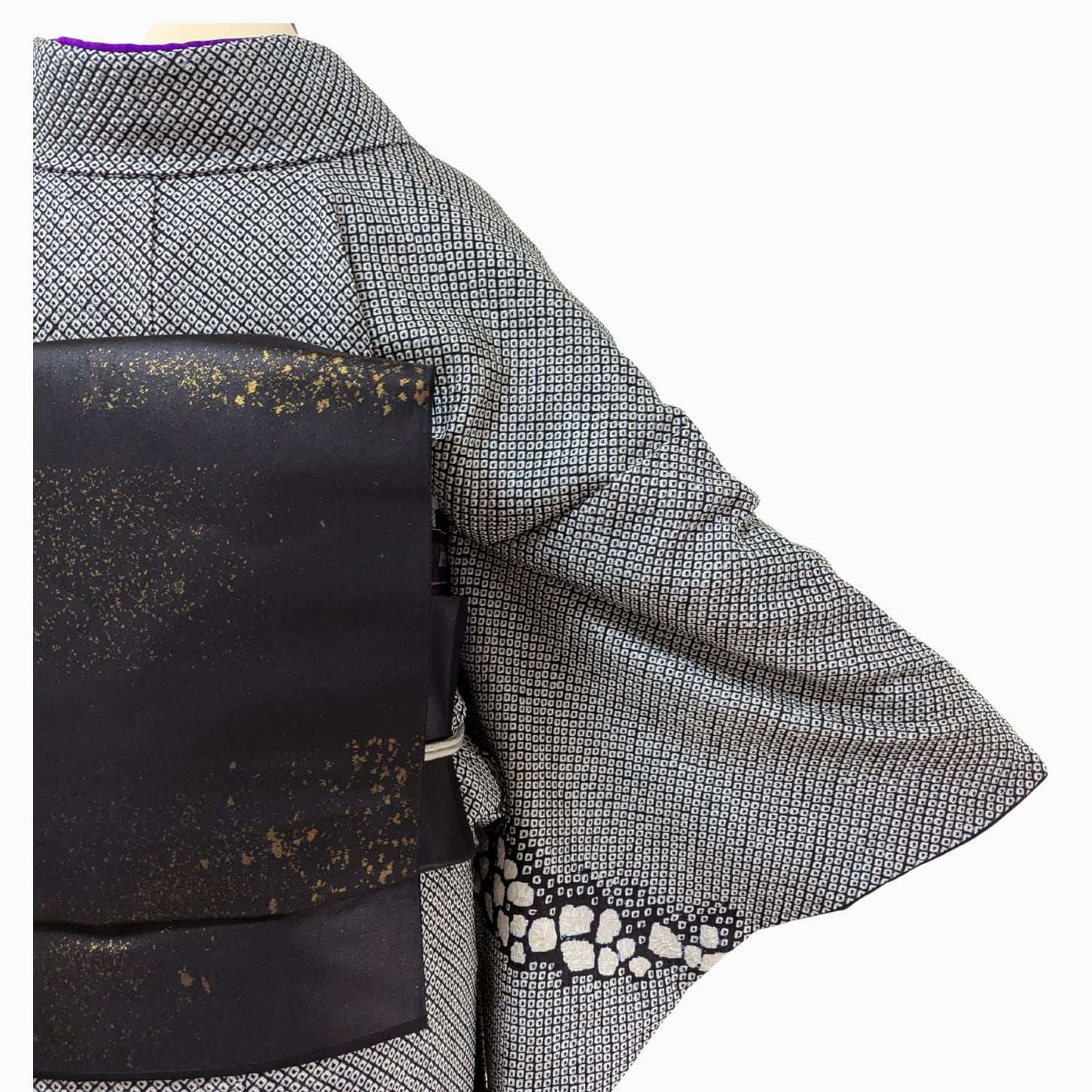 帯はお着物の雰囲気と合わせて黒系、帯締めは伊達衿の紫とリンクさせ、帯揚げは帯となじませた色にしています。