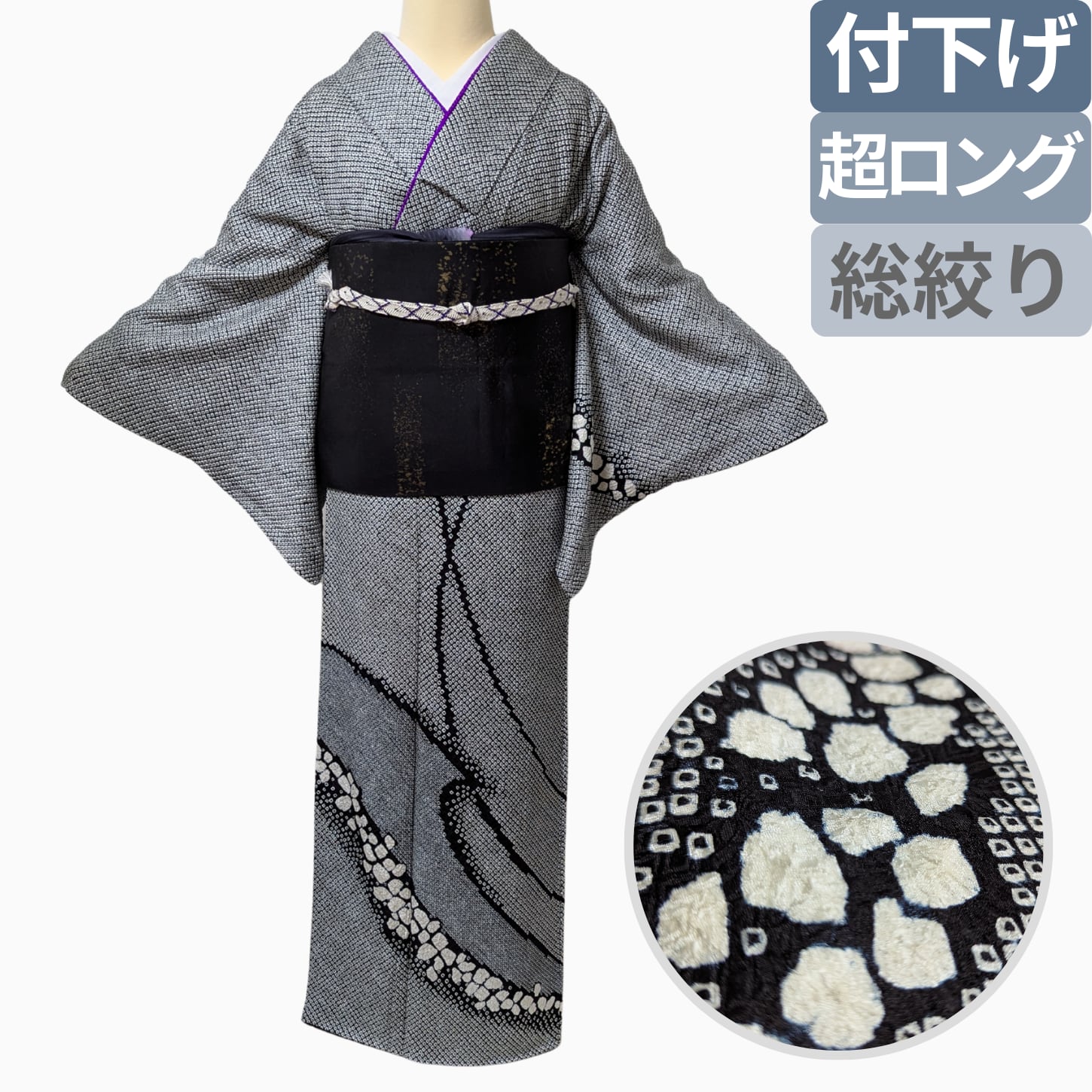 【裄長】超ロング丈 付下げ 正絹 袷 総絞り 流線 玉砂利の純白ロード 黒✕白 丈176裄68