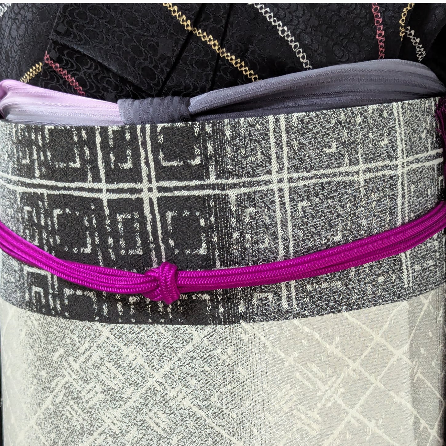高級な袋帯ですが、しっとりとしたクラシカルな花柄訪問着よりは、抽象的柄の訪問着、付下げ、シャイニーな紬、デザイン化された花紋の色無地など「個性的な」お着物をさらにひきたてます。