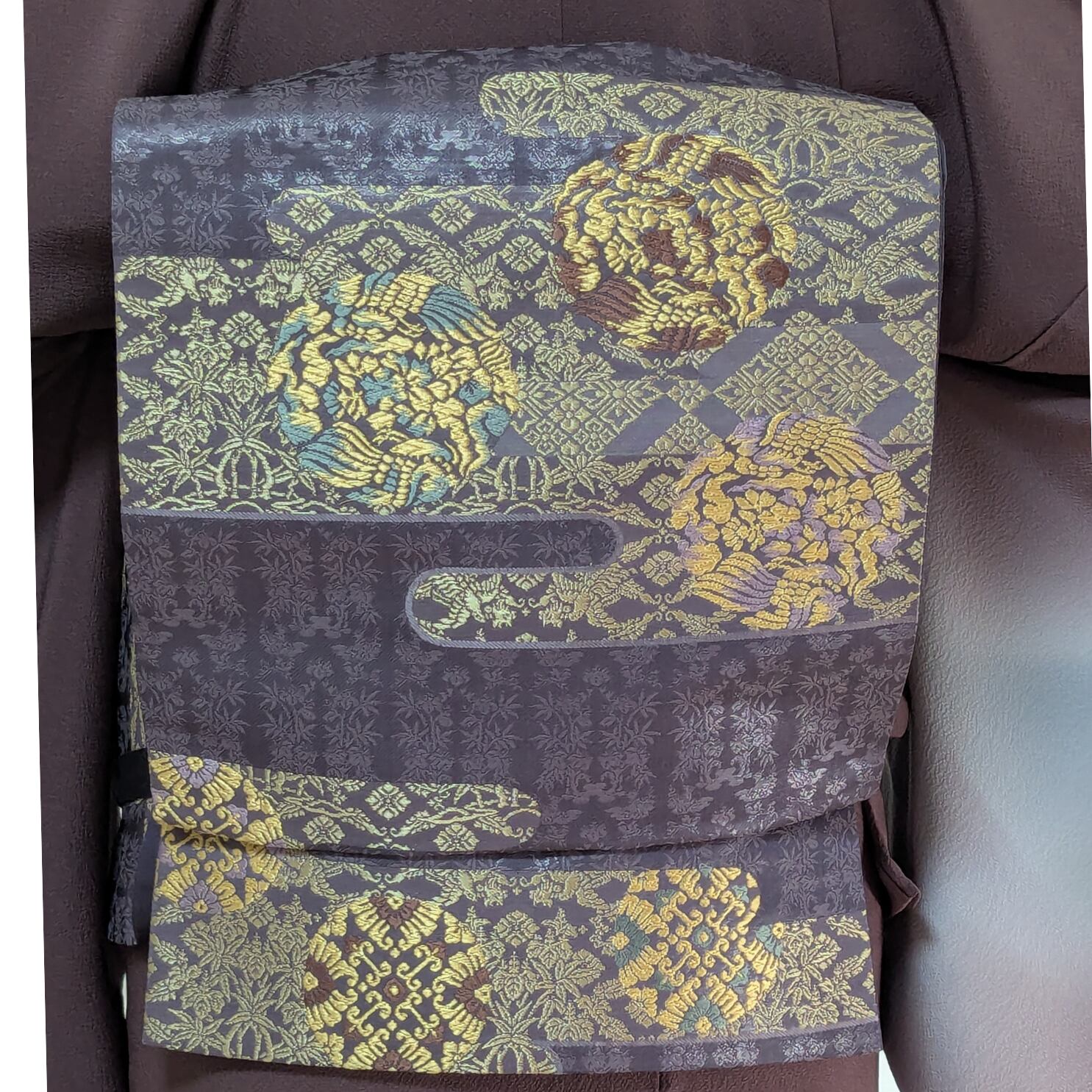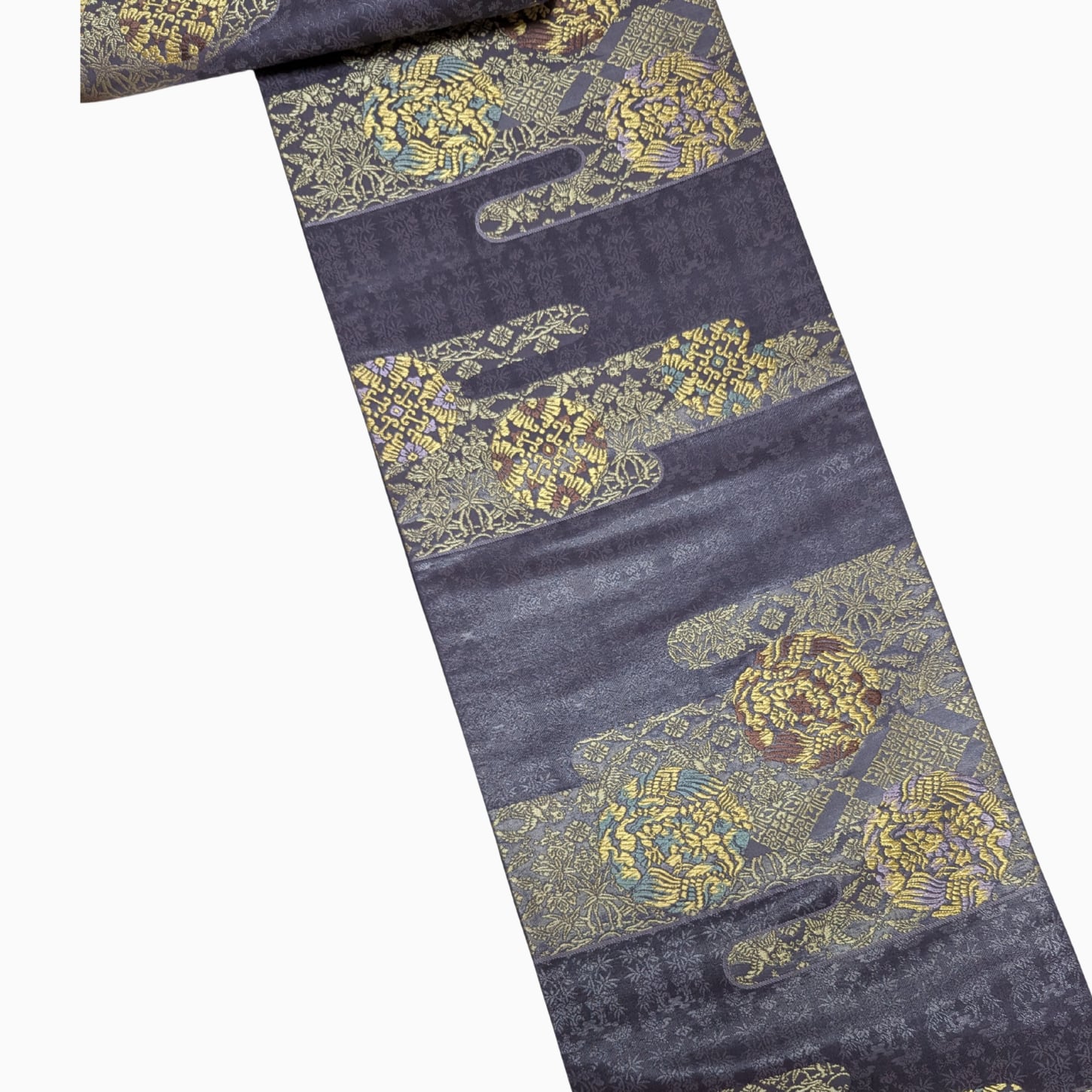 【使用感少】袋帯 六通 正絹 引箔 ヱ霞に丸紋 花鳥織出し モーブパープル✕アンティックゴールド