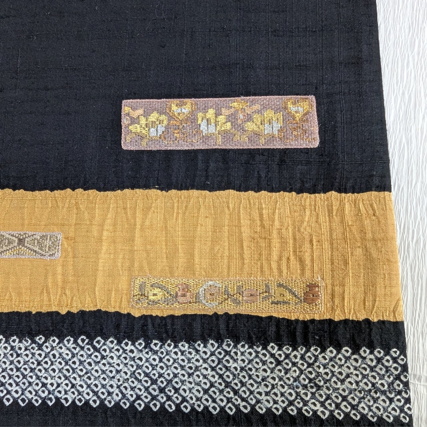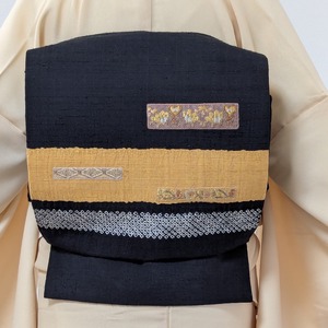 【使用感なし】開き名古屋帯 正絹 手織り紬 草花の刺繍 絞り横段染め分け 黒✕山吹色