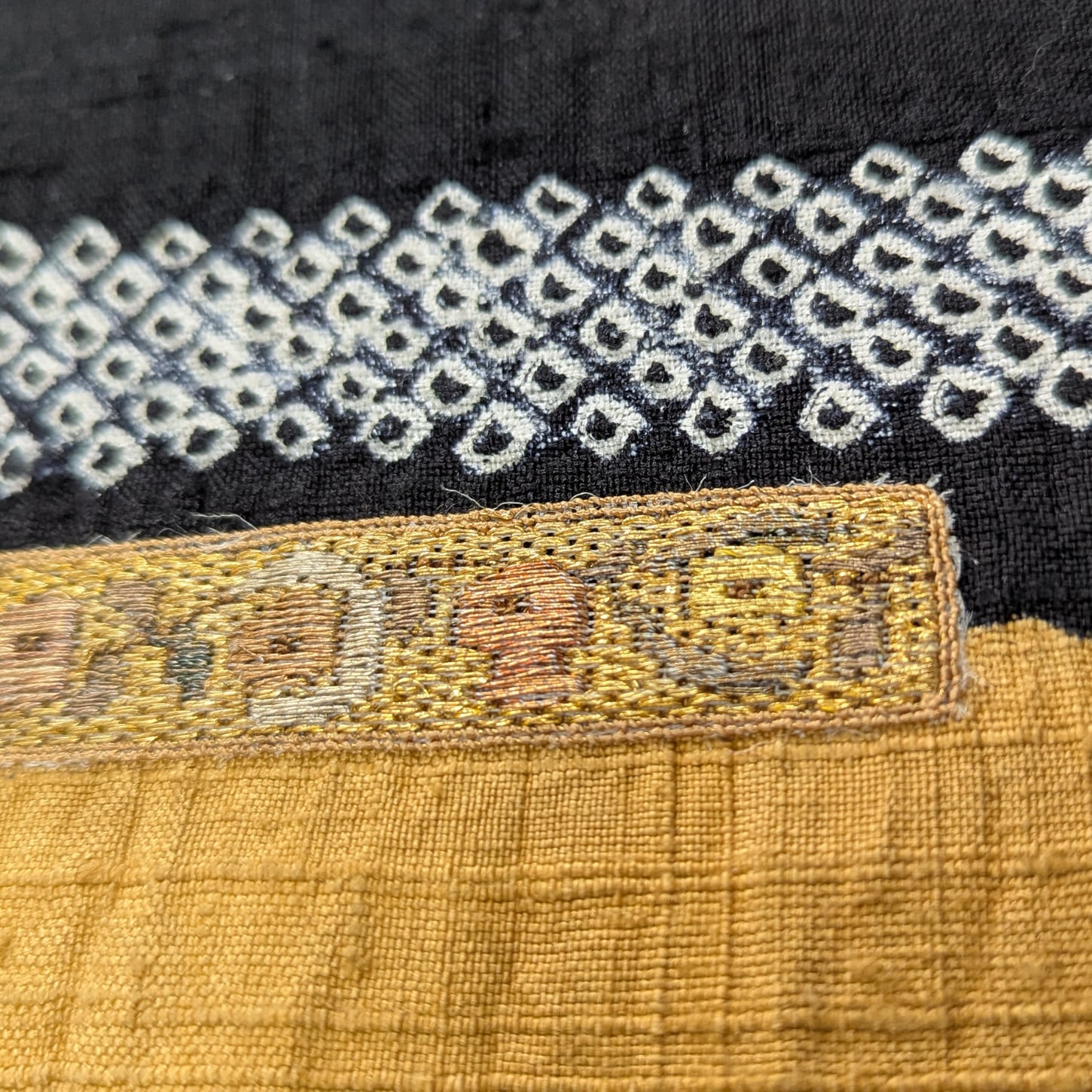 鹿の子絞り柄、手織りならではの節がありながら、黒と山吹色というコントラストの強いカラーはモダンさを感じます。