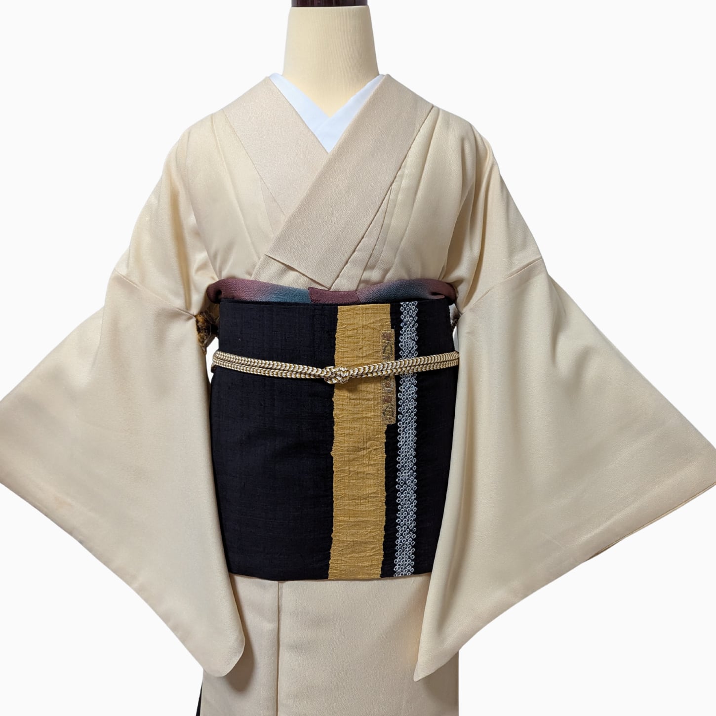 明るい色の着物に合わせて、視線を上下に分ける役目をします。