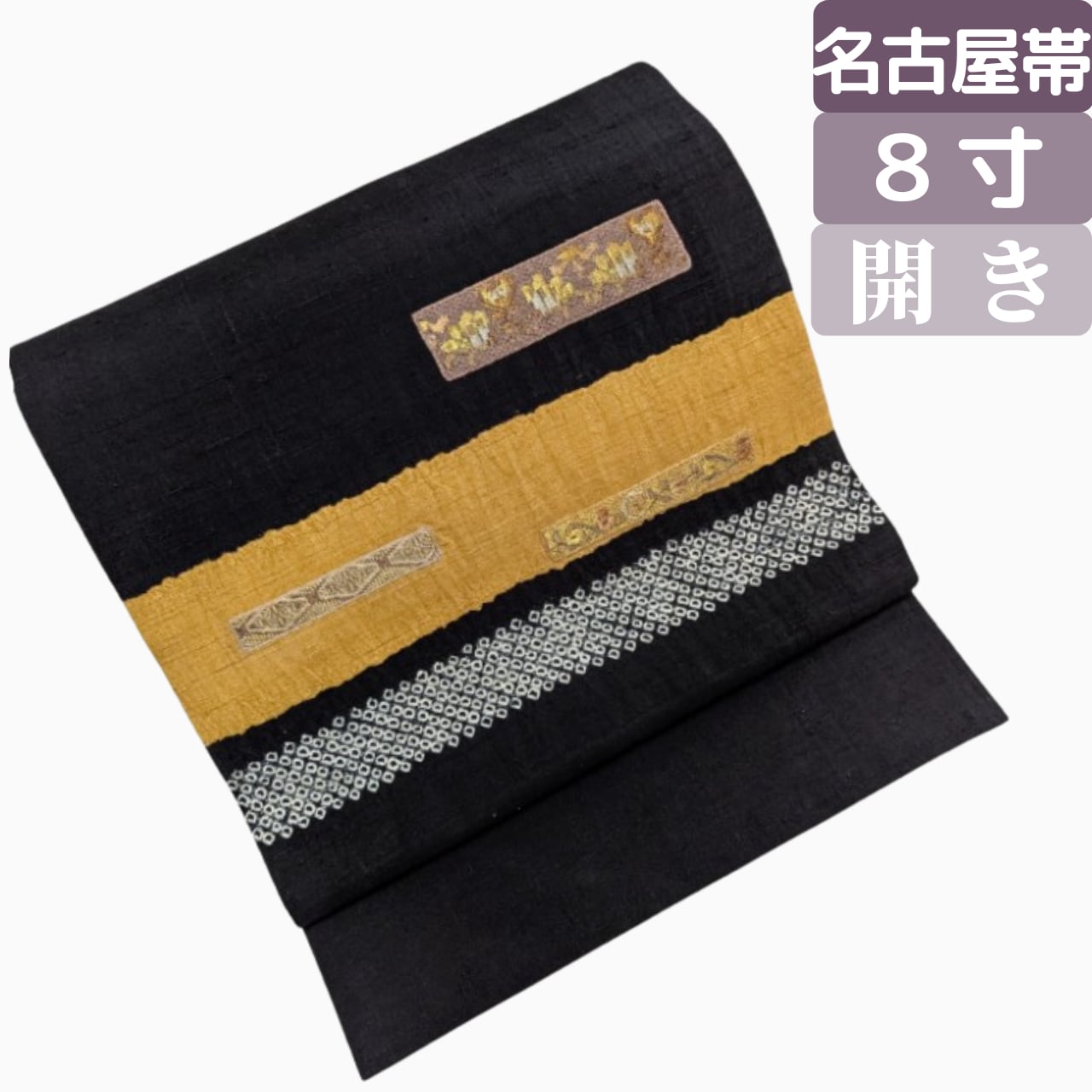 名古屋帯, 開き名古屋帯, 正絹, 手織り紬, 黒帯, 山吹色, 鹿の子絞り, カジュアル帯, トールサイズ向き, コントラスト帯