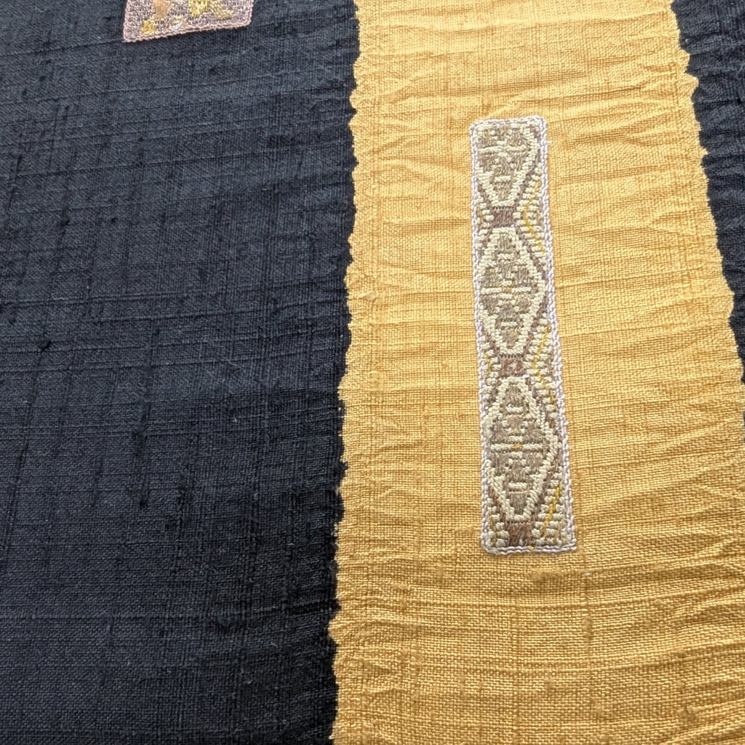 草花の刺繍が施された別布でアクセントになっており、手織りの素朴さと手仕事感を感じるどこか懐かしさを感じさせるような帯。