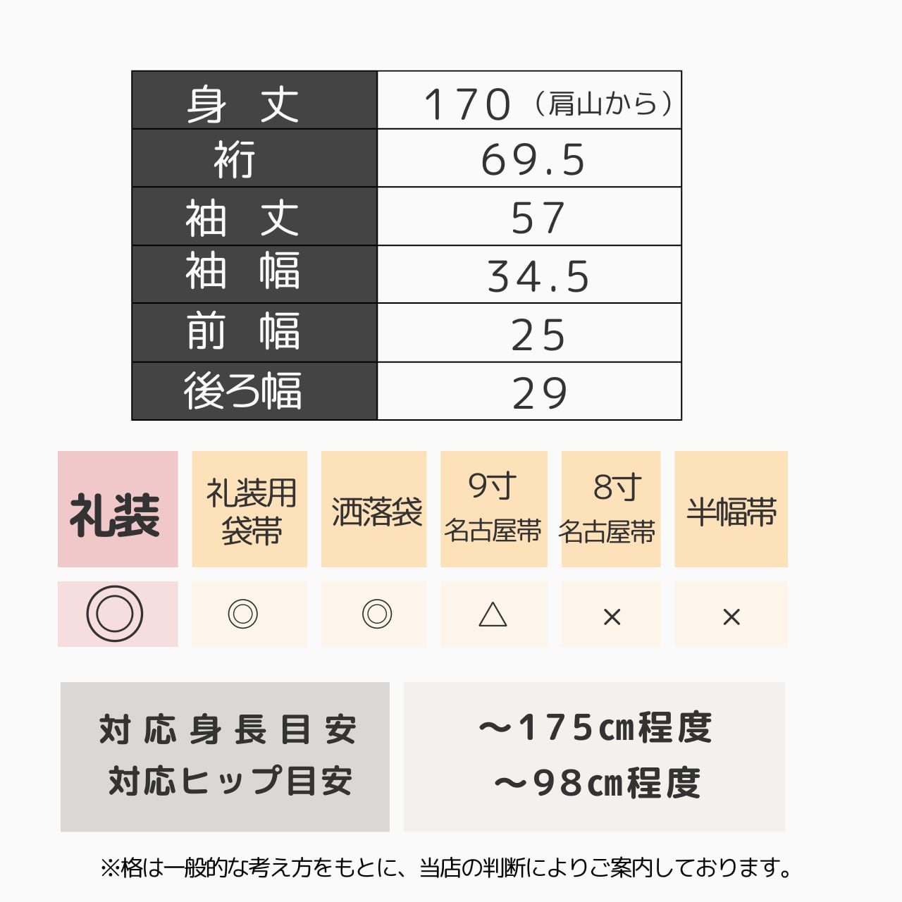身丈170cm、裄69.5cm。