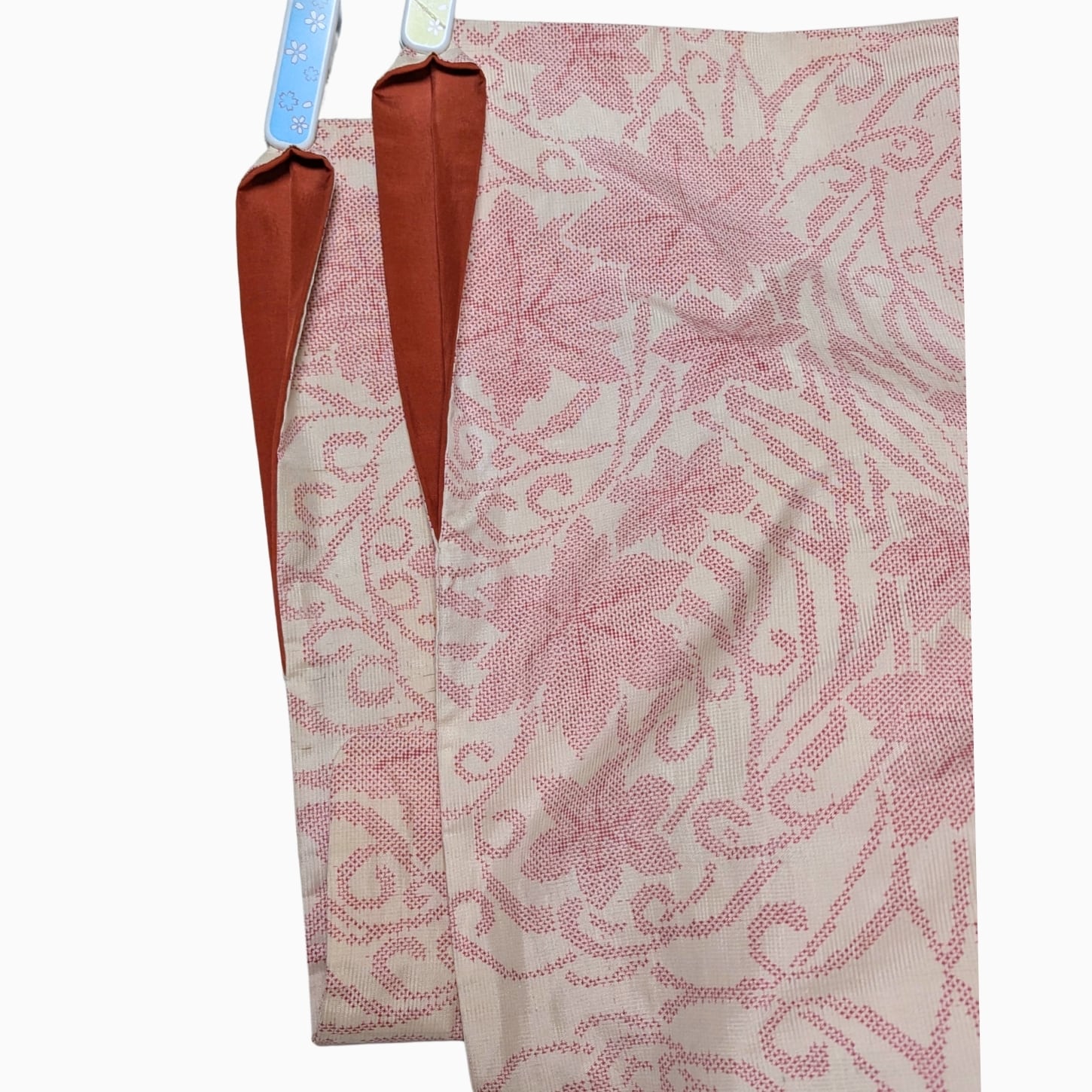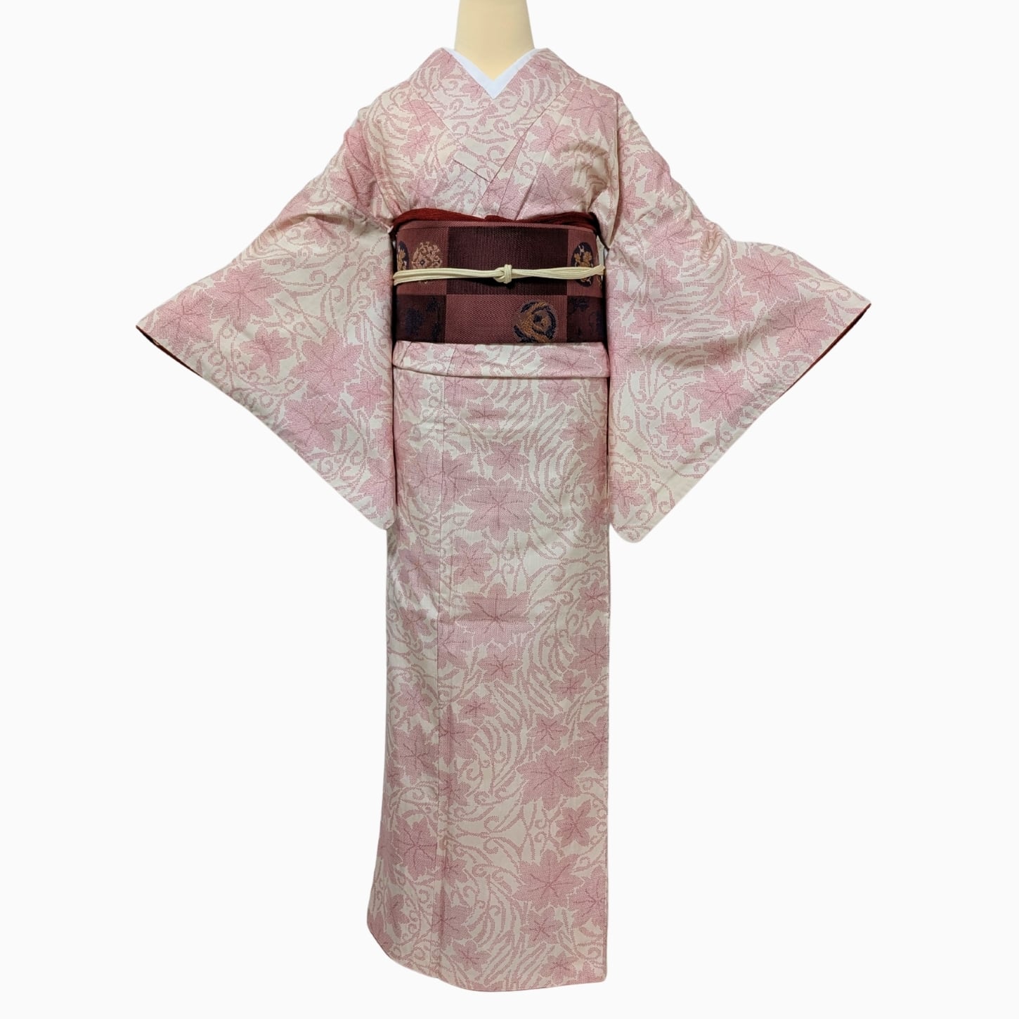 【ややゆったり】紬 正絹 袷 赤×オフ白 紅葉につた柄 織出し 丈163 裄66
