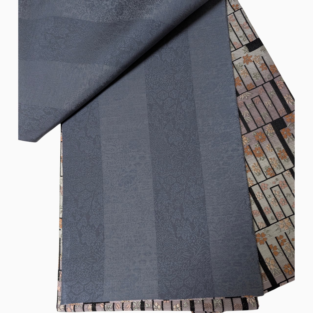直線的に並ぶ源氏香柄に、四季の草花の文様が静かに散りばめられた意匠。