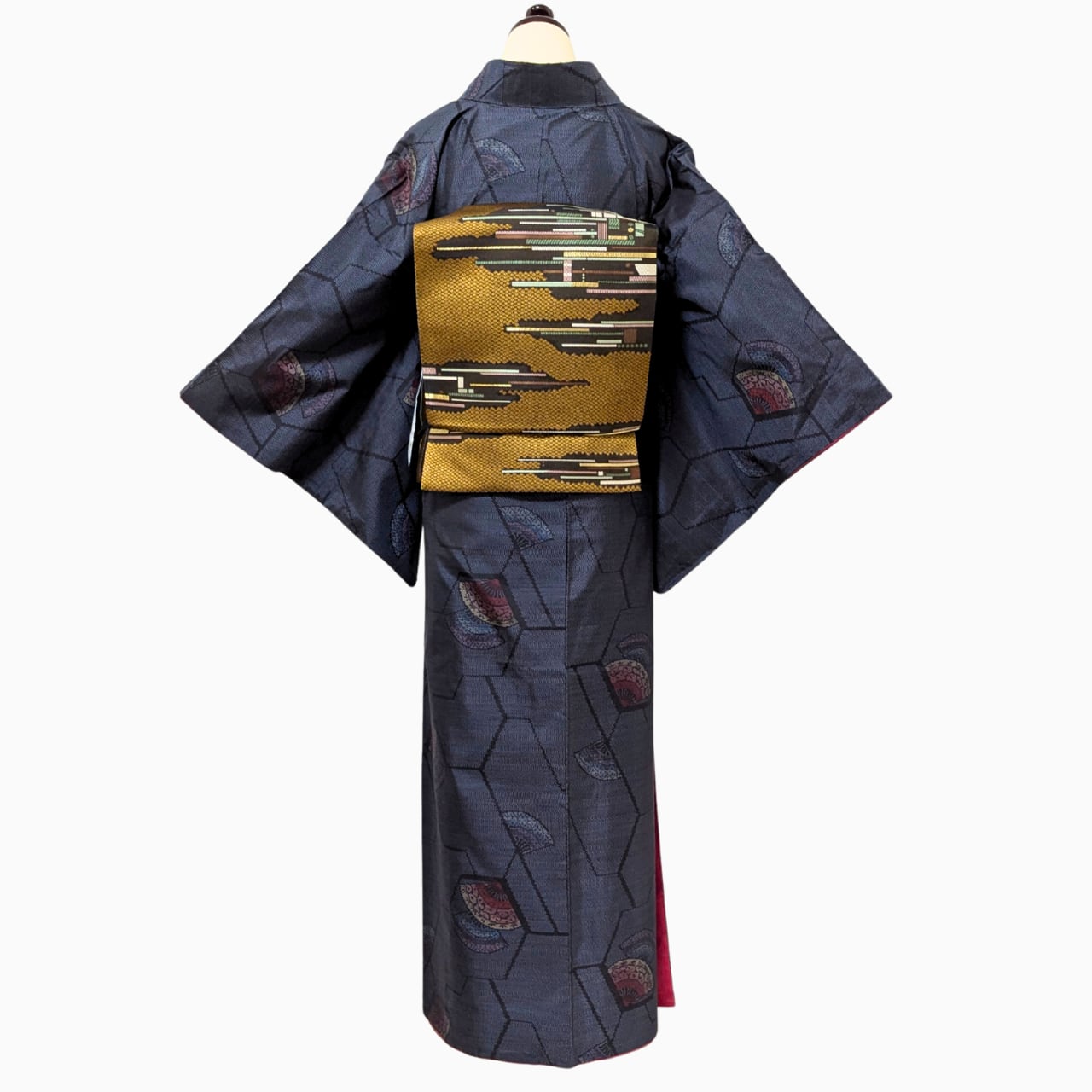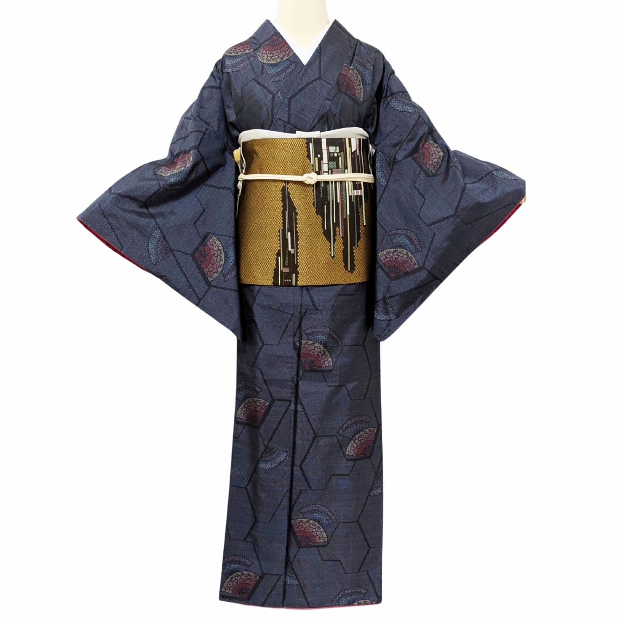 紬, 正絹, 紺, 扇文様, モダン, 軽やか, 裄長め, 洒落着, 街歩き, 観劇