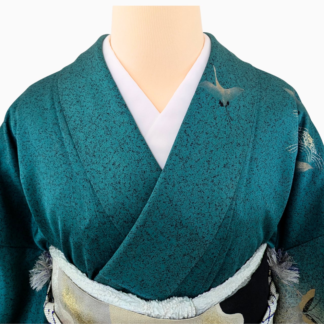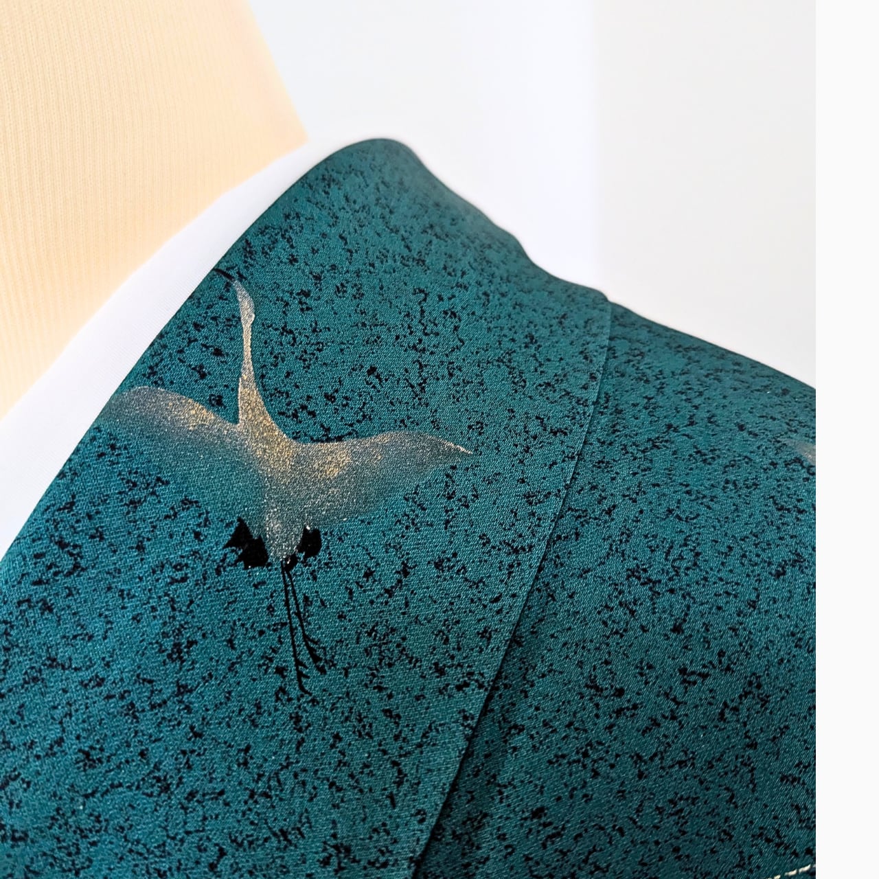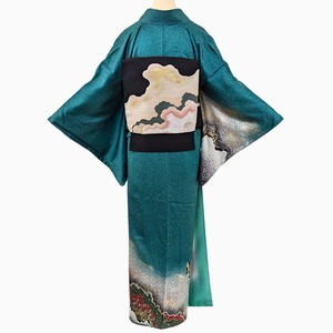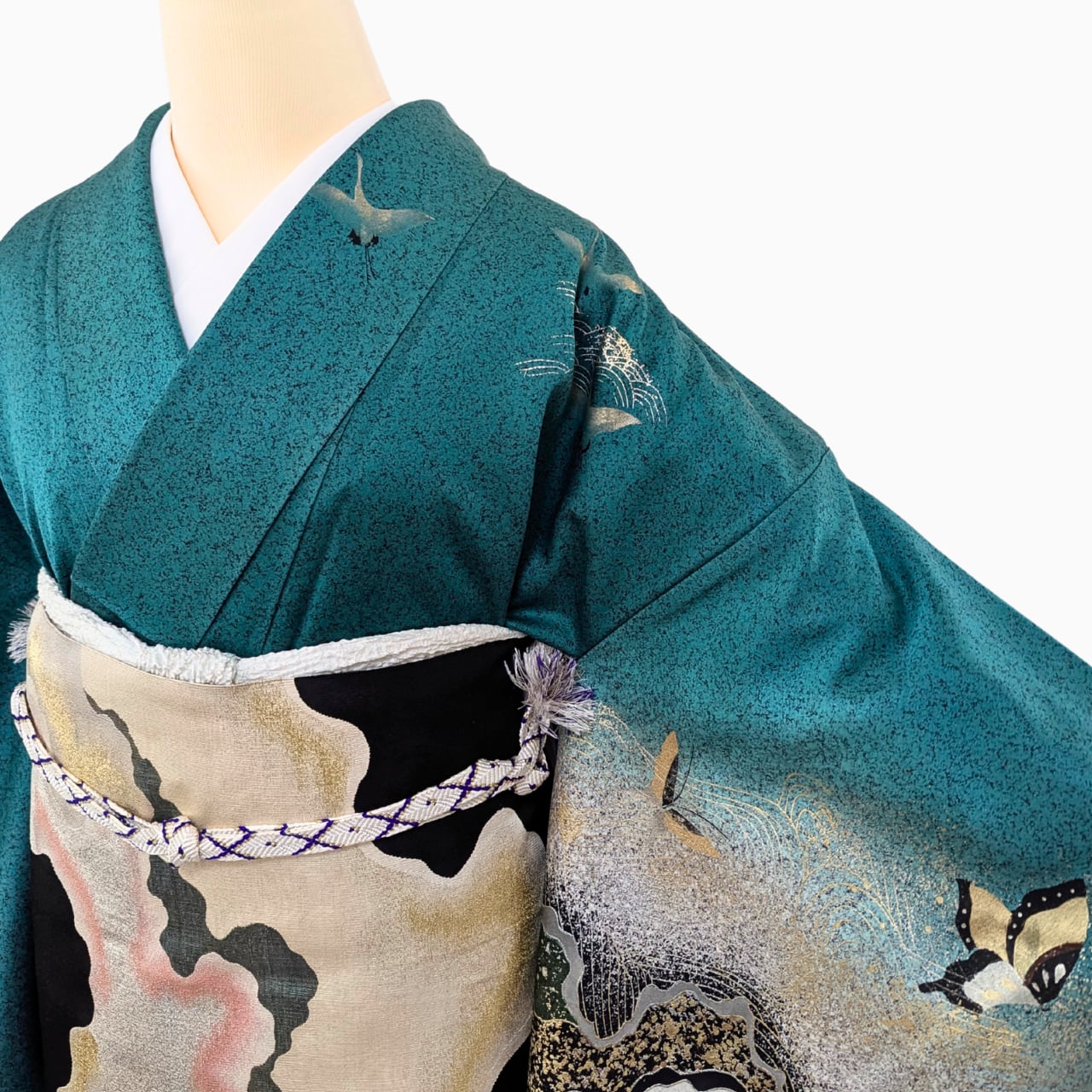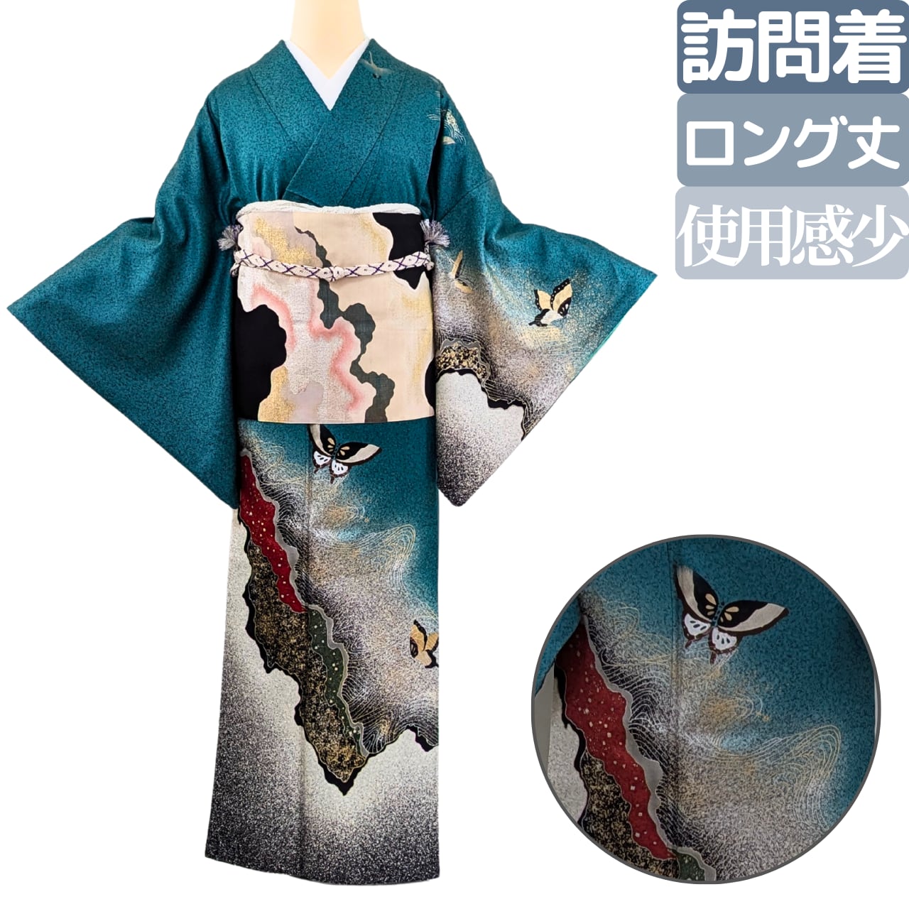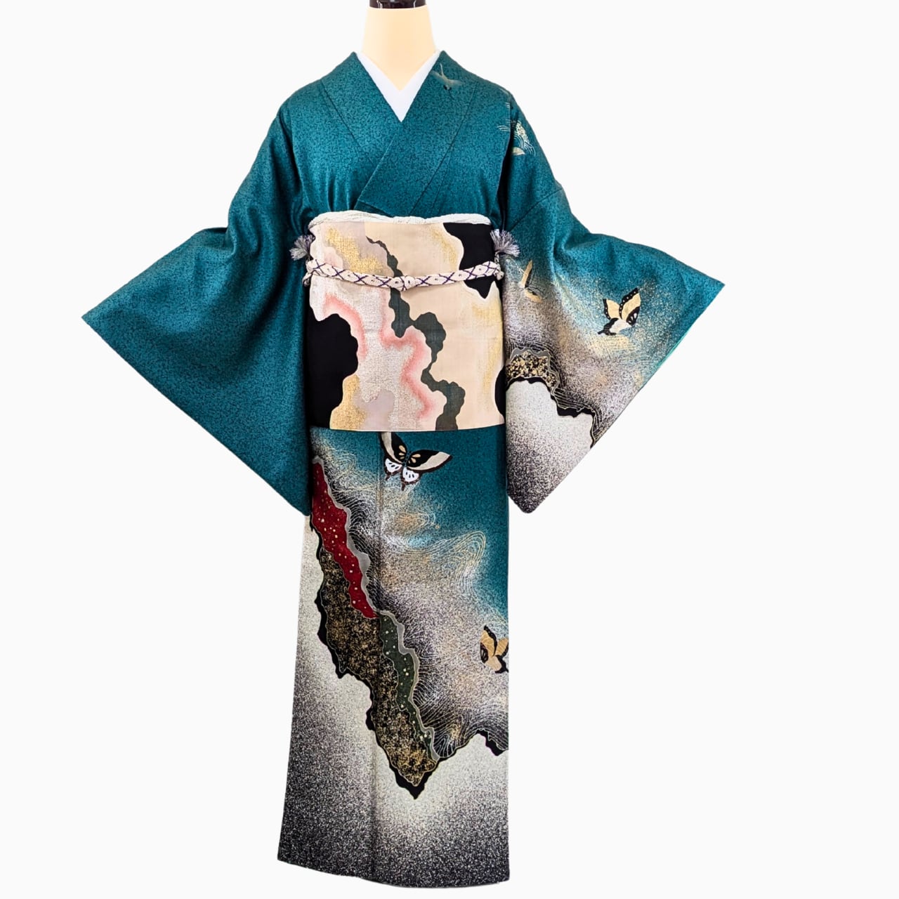 青みを含んだ深いグリーンの地に、大胆な染め分けと蝶の意匠が静かに浮かび上がる訪問着です。