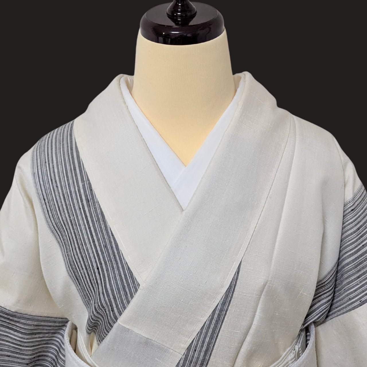 紬, 正絹, 縦縞, オフ白, 黒縞, 手織り, 未使用, 袷, カジュアル, きれいめカジュアル,白い着物,大人の着物