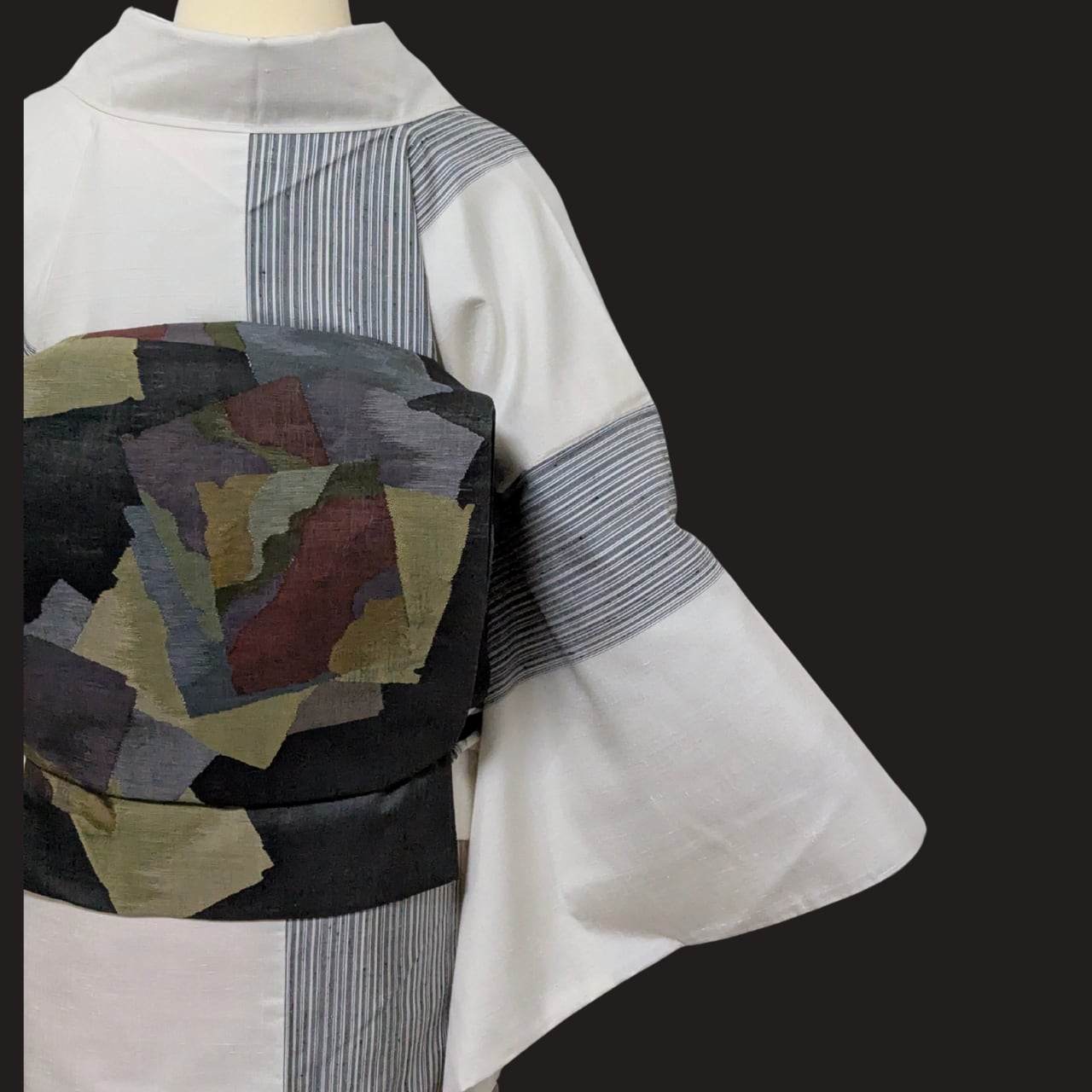名古屋帯で洗練された日常着に、モダンな帯でエッジを効かせてもいい。