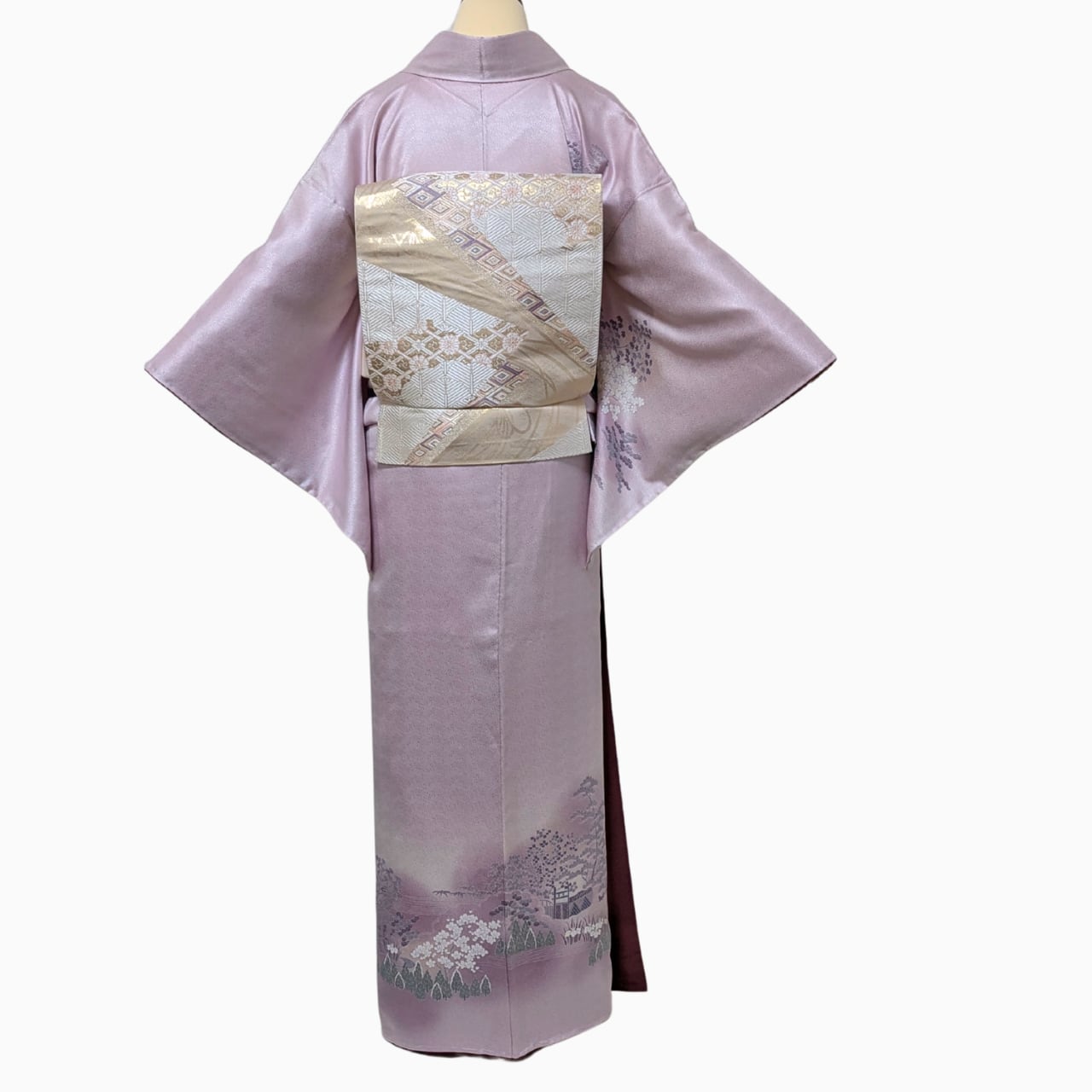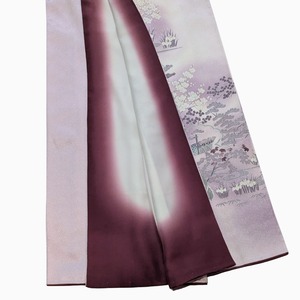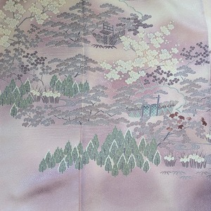 ・ 淡いパープルピンク地に 四季の花と家屋の意匠が広がる優美な付下げ