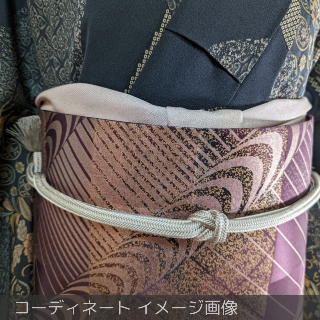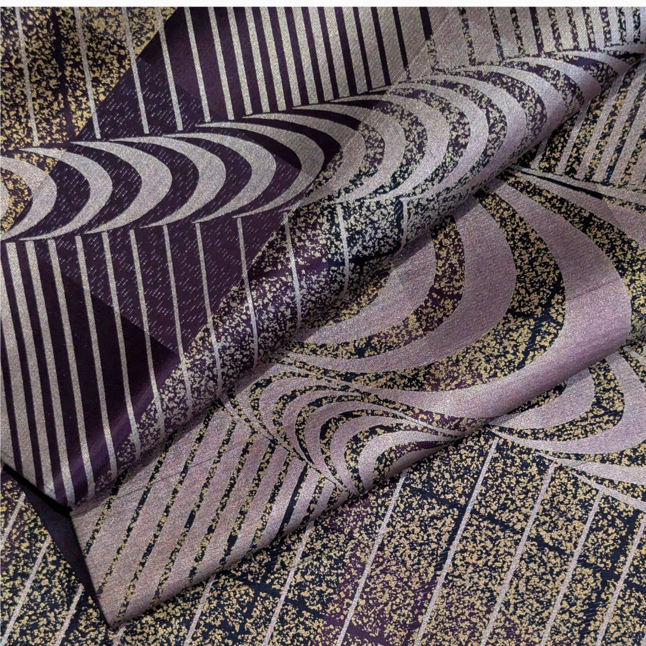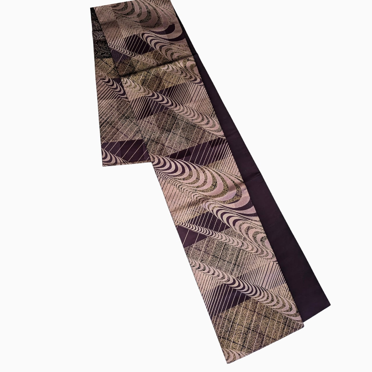 洒落袋帯,袋帯寄り,正絹帯,六通柄,紫系帯,モダン帯,抽象柄帯,付下げに合う帯,色無地に合う帯,観劇コーデ帯