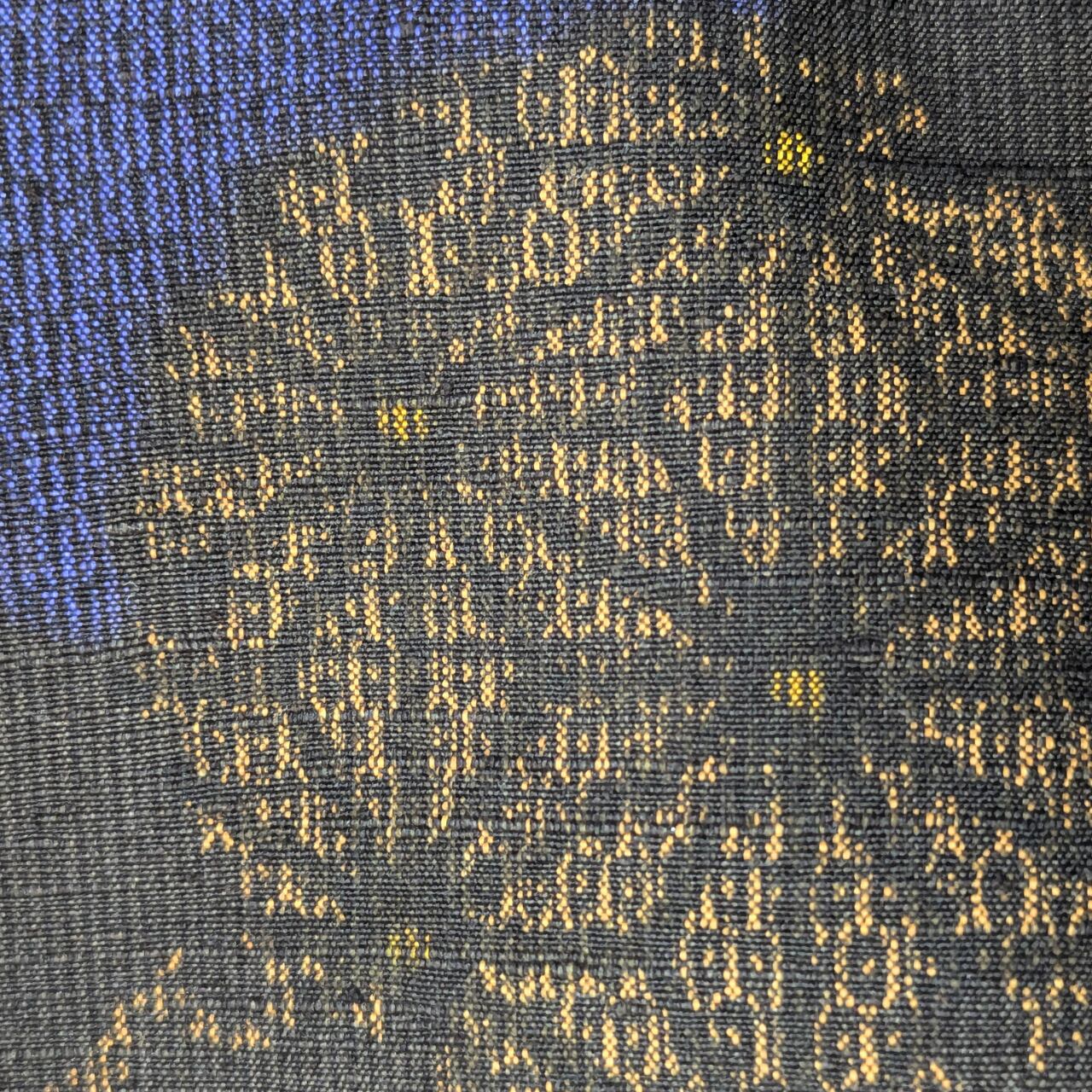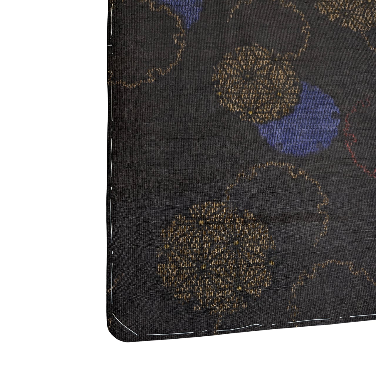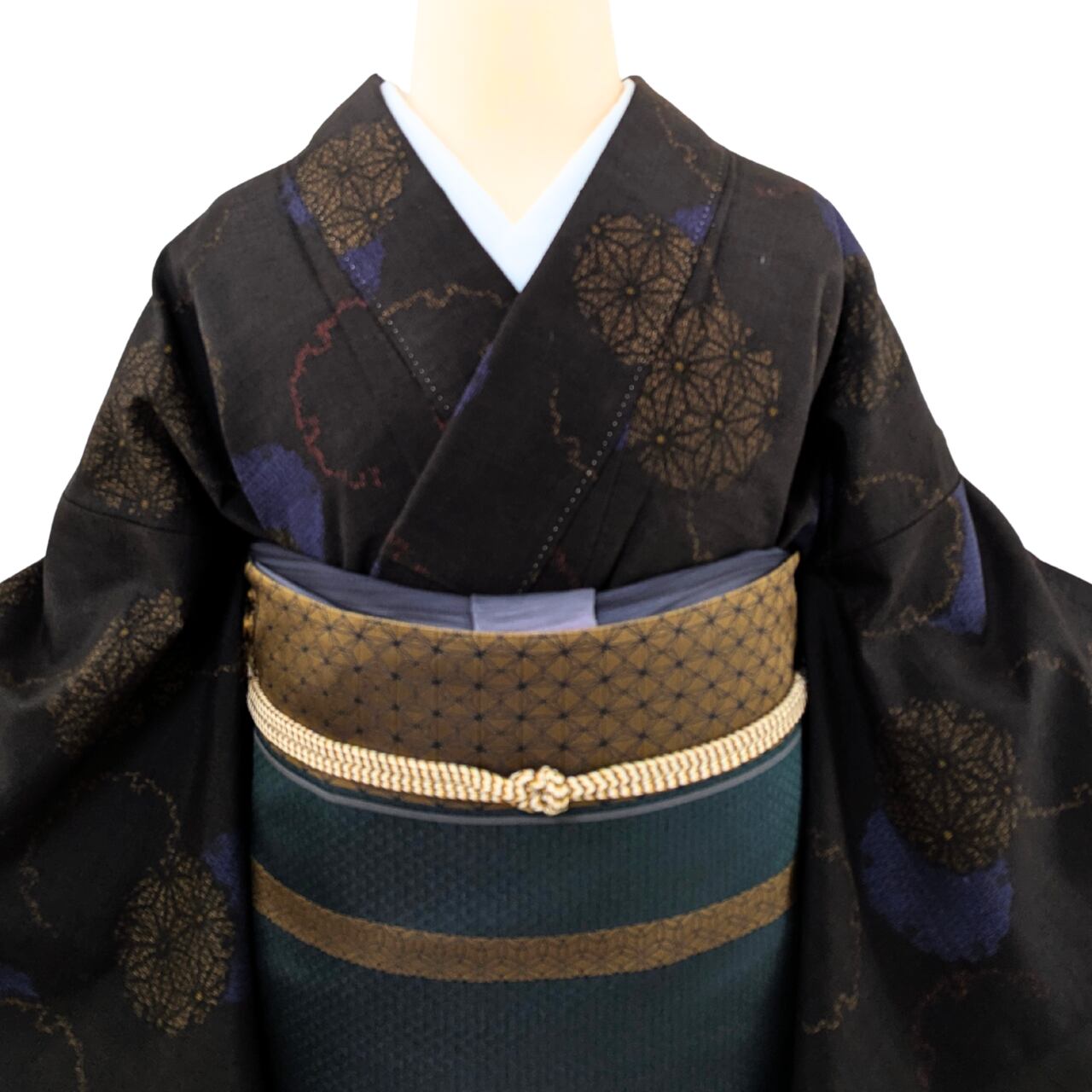 ・焦げ茶ベースの中に雪輪柄と青・マスタード・赤の差し色