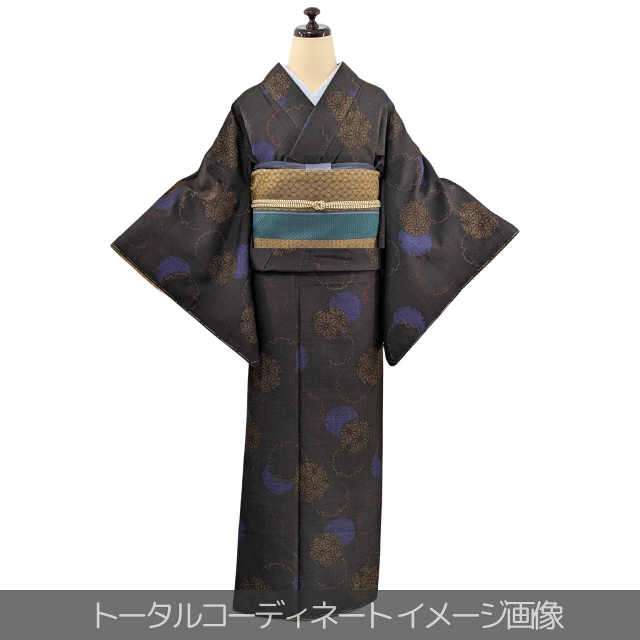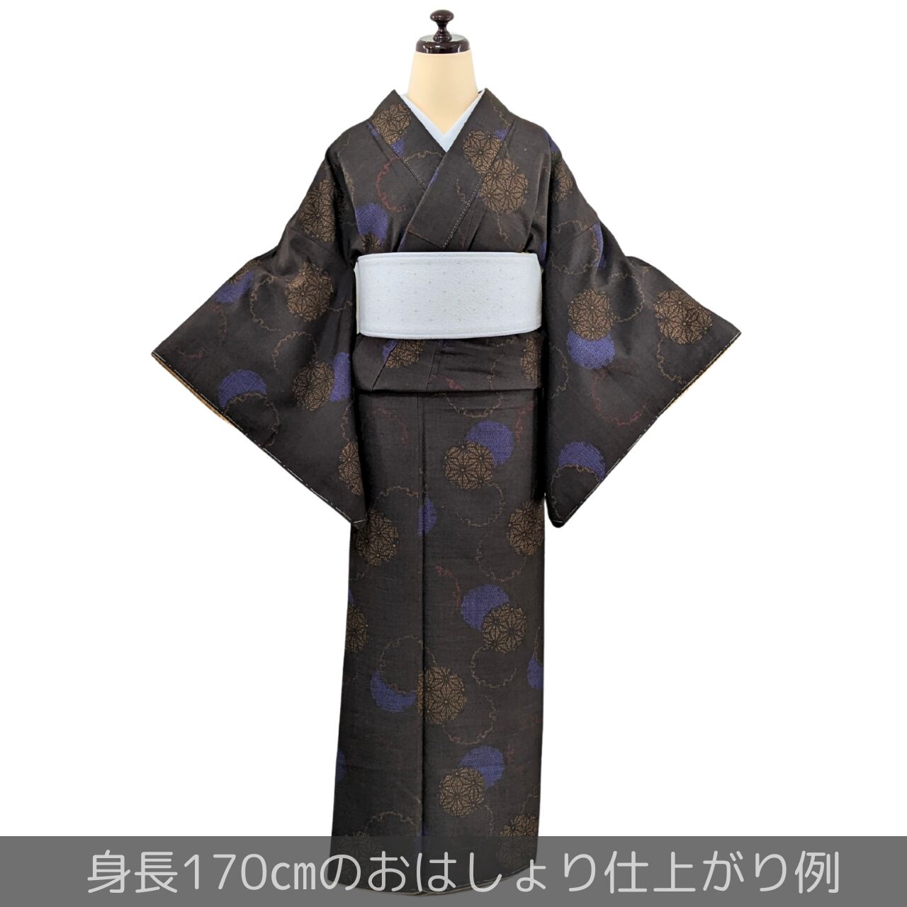 紬,正絹紬,未使用着物,しつけ糸付き,焦げ茶の着物,雪輪柄,ゆったりサイズ着物,身丈164,裄66.5,カジュアル着物