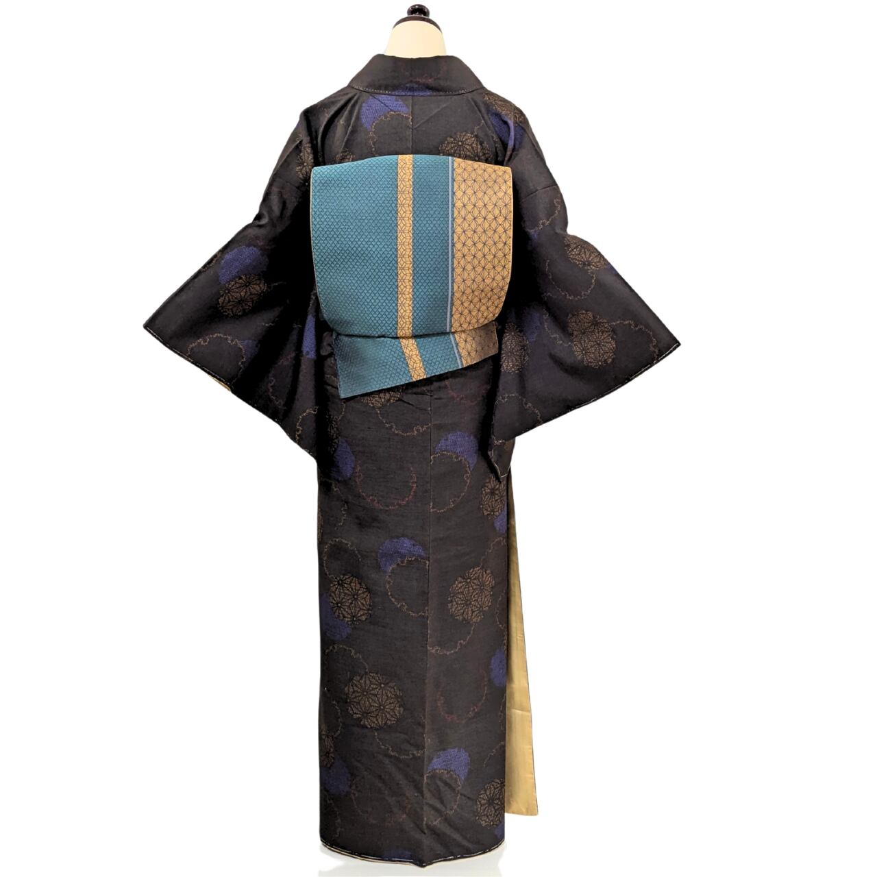 商品画像では、八掛の色とリンクする帯を選んで都会的な雰囲気のするスタイリングに。