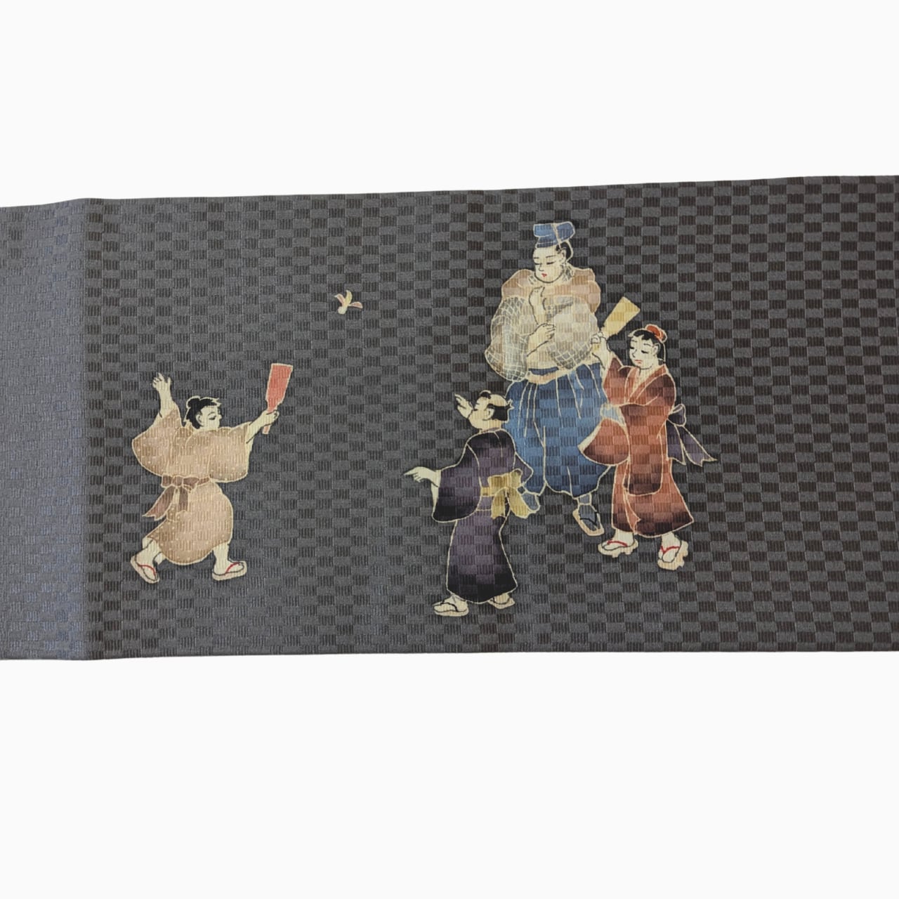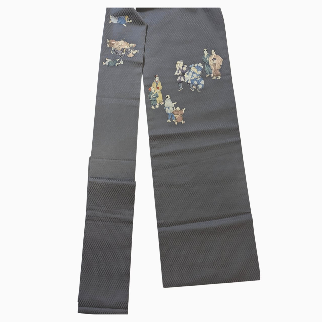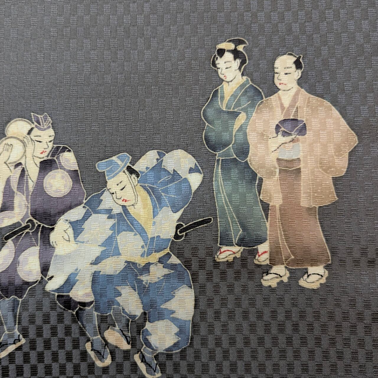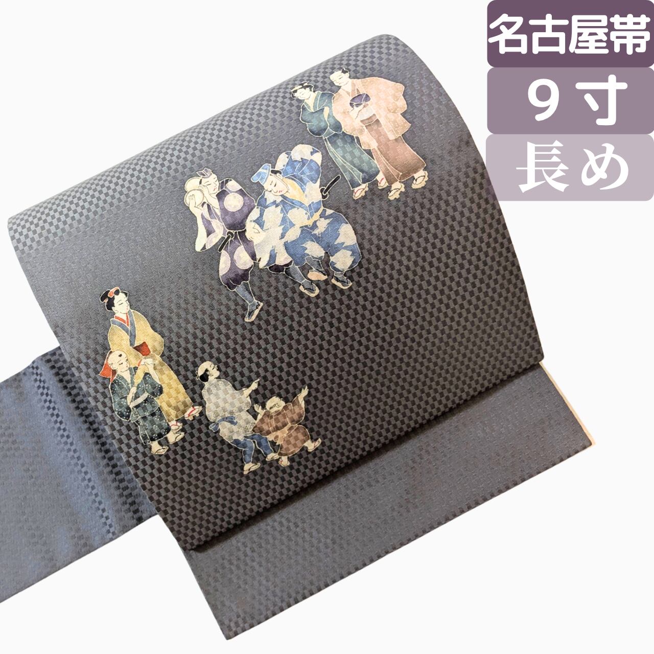 名古屋帯,九寸名古屋帯,正絹帯,人物柄帯,江戸風柄,グレーの帯,市松柄帯,小紋に合う帯,紬に合う帯,きれいめカジュアル帯
