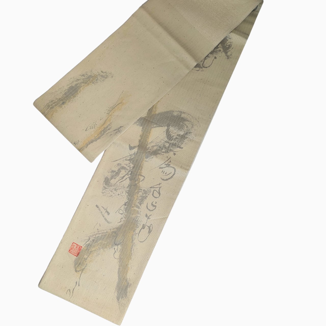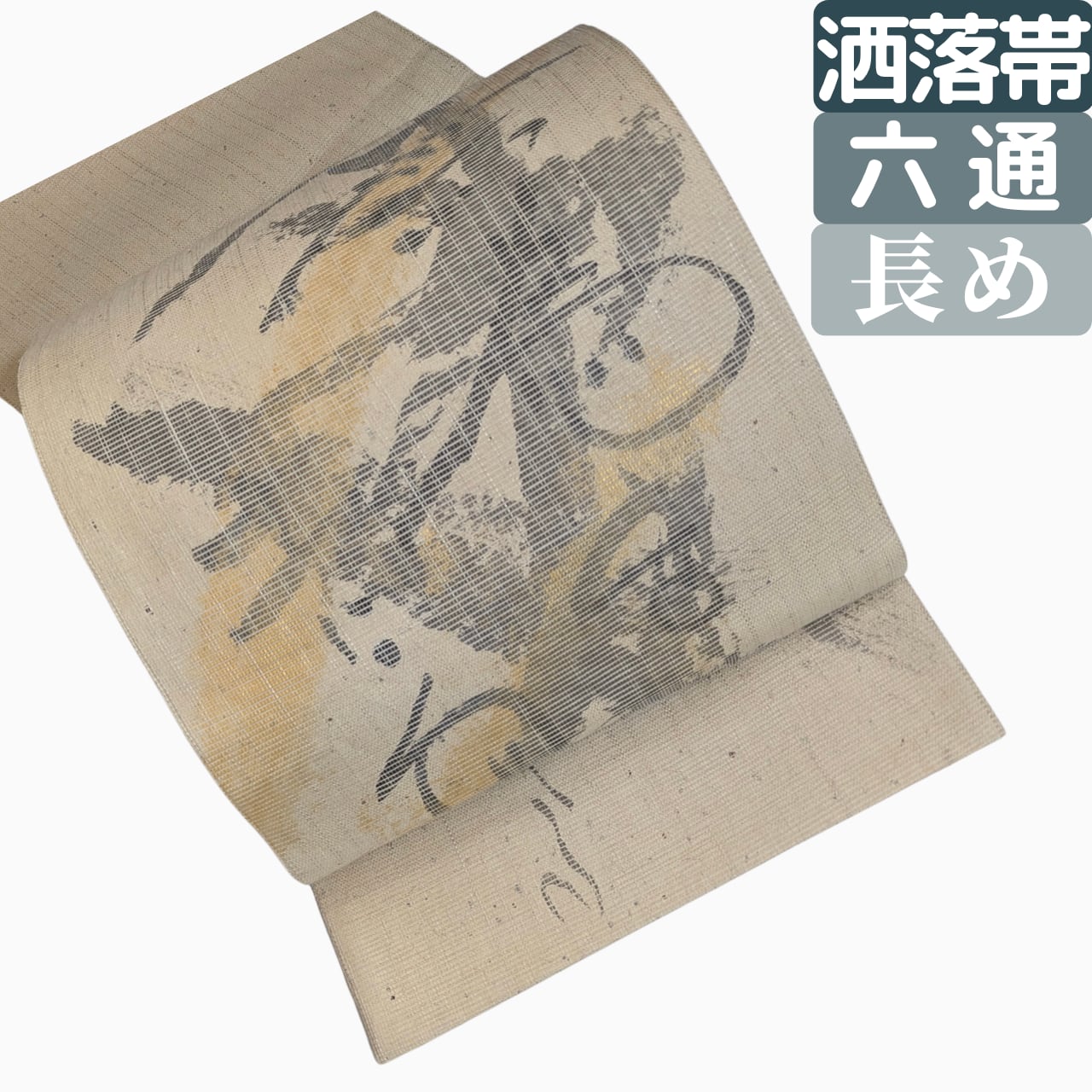 洒落袋帯,六通袋帯,長めの帯,筆描き柄帯,ベージュ系帯,和紙布風帯,軽い袋帯,紬に合う帯,小紋に合う帯,ガード加工帯