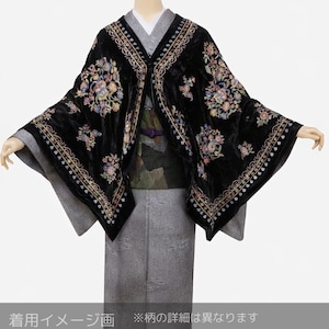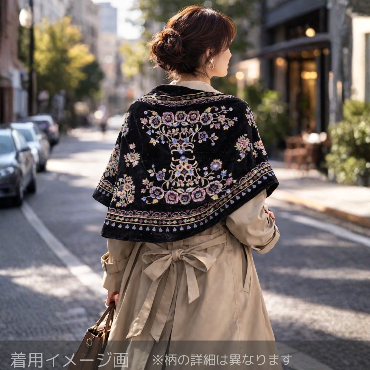 【未使用品】岡重OKAJIMA シルク 大判ショール ベルベット&シースルー 黒✕カラフル更紗