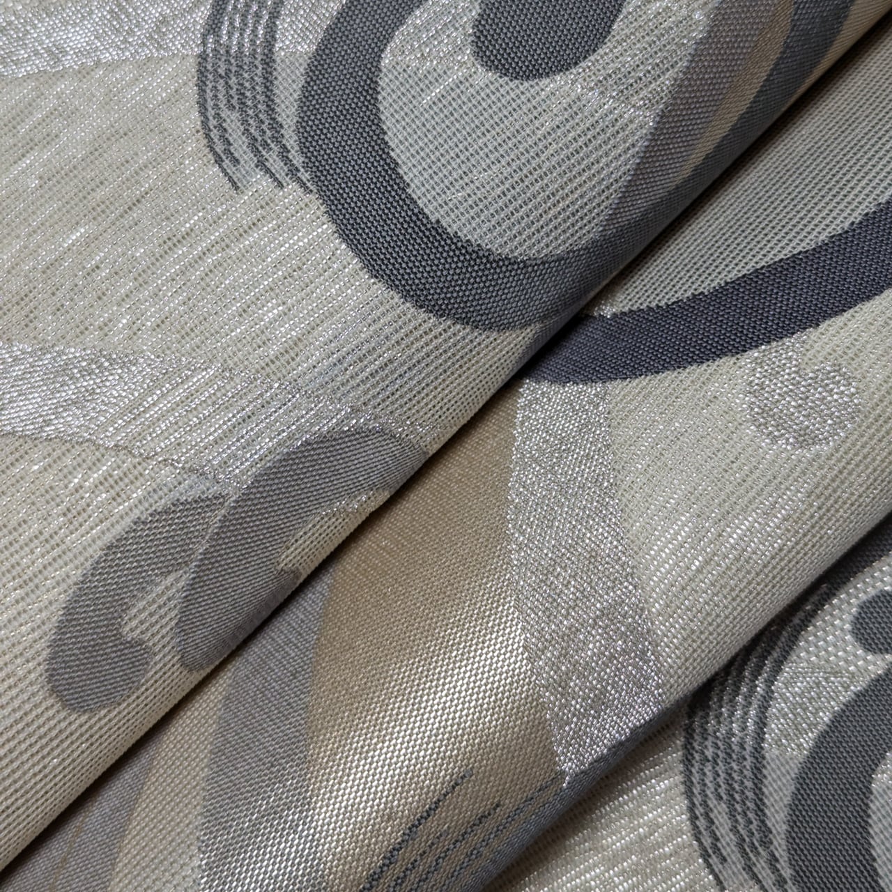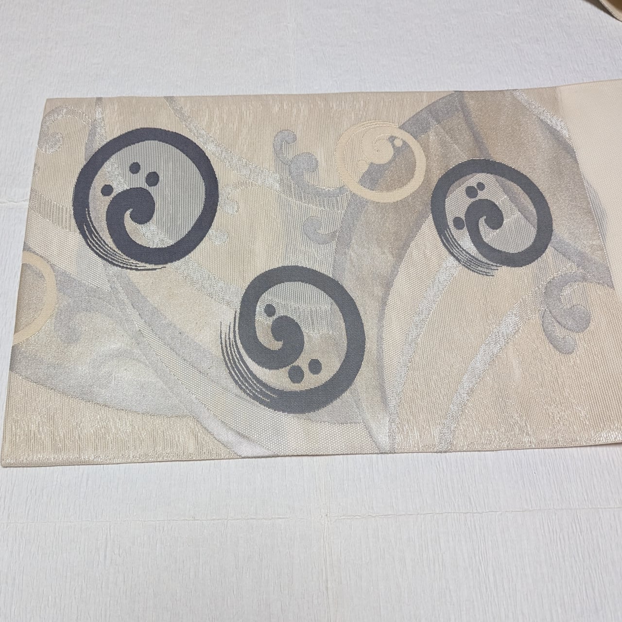 【夏帯】袋帯 紗 正絹 六通 波と渦巻き波頭 金糸銀糸使い 淡いクリーム✕グレー
