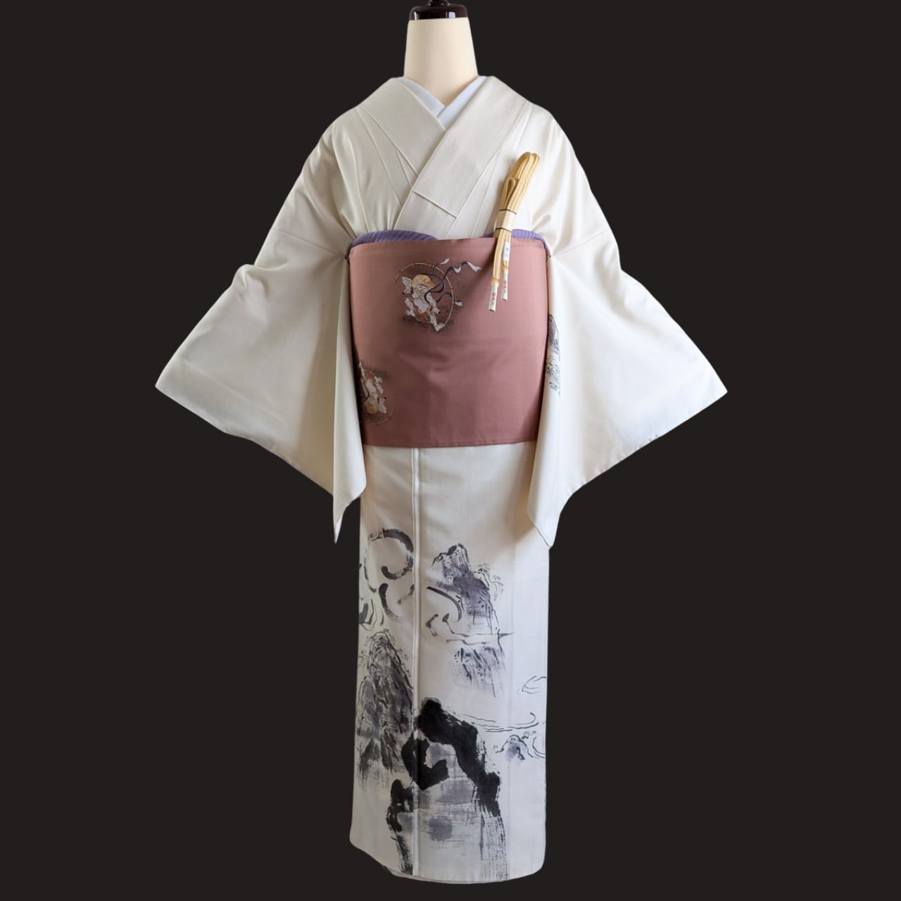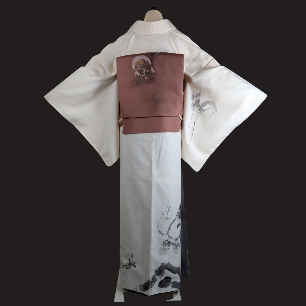 生地は手織り紬で温かみがあり、柄は古えの風景を墨絵で表現した力強いものです。